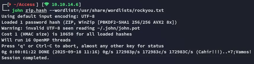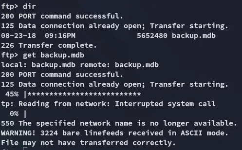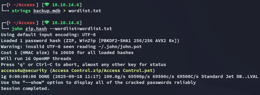 Instead I went ahead and used the output of the backup.mdb file in combination with strings to create a password list which I then would use to crack the password: