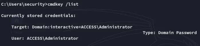Using the cmdkey /list command we figure out that there are stored creds for the Administrator on the machine: