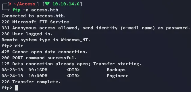 PORT STATE SERVICE REASON VERSION21/tcp open ftp syn-ack Microsoft ftpd| ftp-anon: Anonymous FTP login allowed (FTP code 230)|_Cant get directory listing: PASV failed: 425 Cannot open data connection.| ftp-syst:|_ SYST: Windows_NT23/tcp open telnet syn-ack Microsoft Windows XP telnetd (no more connections allowed)80/tcp open http syn-ack Microsoft IIS httpd 7.5|_http-title: MegaCorp|_http-server-header: Microsoft-IIS/7.5| http-methods:| Supported Methods: OPTIONS TRACE GET HEAD POST|_ Potentially risky methods: TRACEService Info: OSs: Windows, Windows XP; CPE: cpe:/o:microsoft:windows, cpe:/o:microsoft:windows_xpI noticed that ftp was readable using anon access.
