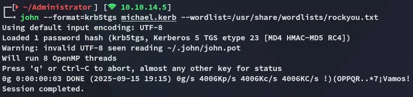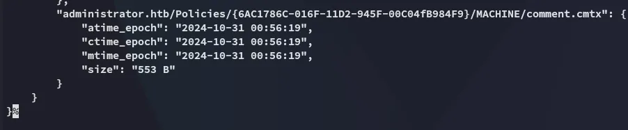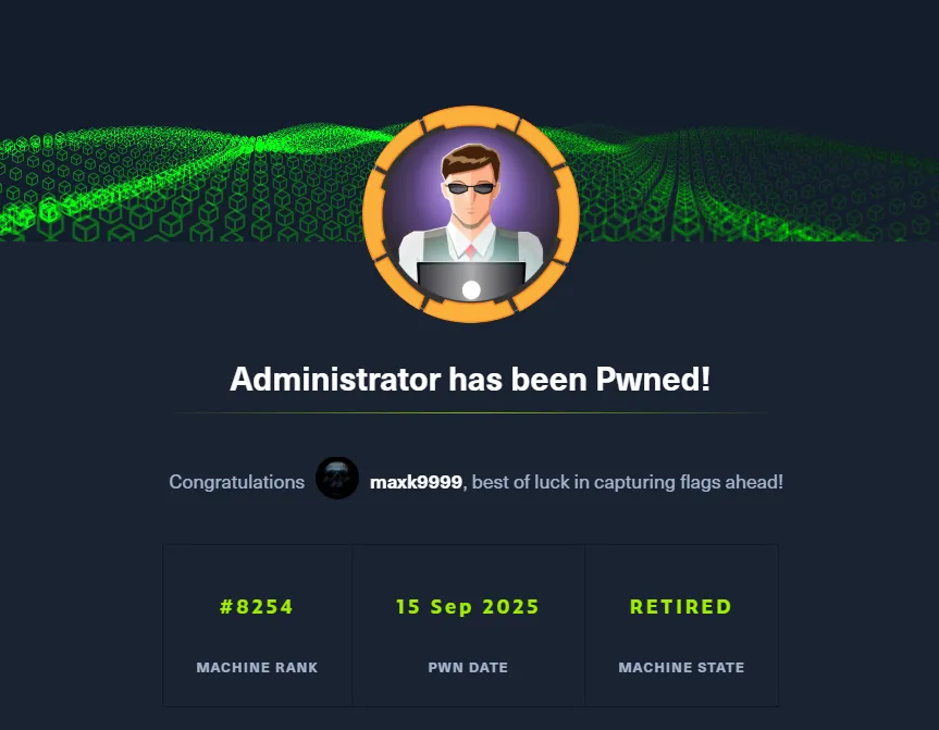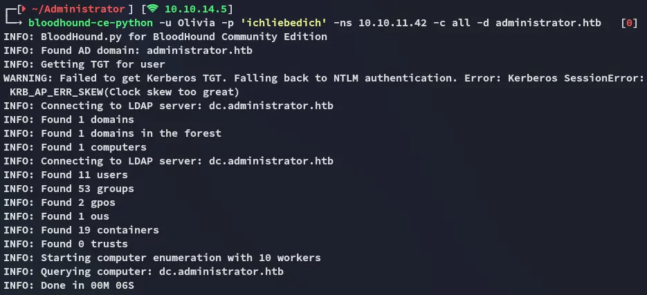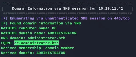 PORT STATE SERVICE REASON VERSION21/tcp open ftp syn-ack Microsoft ftpd| ftp-syst:|_ SYST: Windows_NT53/tcp open domain syn-ack Simple DNS Plus88/tcp open kerberos-sec syn-ack Microsoft Windows Kerberos (server time: 2025-09-15 16:40:38Z)135/tcp open msrpc syn-ack Microsoft Windows RPC139/tcp open netbios-ssn syn-ack Microsoft Windows netbios-ssn389/tcp open ldap syn-ack Microsoft Windows Active Directory LDAP (Domain: administrator.htb0., Site: Default-First-Site-Name)445/tcp open microsoft-ds? syn-ack464/tcp open kpasswd5? syn-ack593/tcp open ncacn_http syn-ack Microsoft Windows RPC over HTTP 1.0636/tcp open tcpwrapped syn-ack3268/tcp open ldap syn-ack Microsoft Windows Active Directory LDAP (Domain: administrator.htb0., Site: Default-First-Site-Name)3269/tcp open tcpwrapped syn-ack5985/tcp open http syn-ack Microsoft HTTPAPI httpd 2.0 (SSDP/UPnP)|_http-server-header: Microsoft-HTTPAPI/2.0|_http-title: Not Found9389/tcp open mc-nmf syn-ack .NET Message Framing47001/tcp open http syn-ack Microsoft HTTPAPI httpd 2.0 (SSDP/UPnP)|_http-server-header: Microsoft-HTTPAPI/2.0|_http-title: Not Found49392/tcp open ncacn_http syn-ack Microsoft Windows RPC over HTTP 1.049397/tcp open msrpc syn-ack Microsoft Windows RPC49404/tcp open msrpc syn-ack Microsoft Windows RPC49422/tcp open msrpc syn-ack Microsoft Windows RPC49664/tcp open msrpc syn-ack Microsoft Windows RPC49665/tcp open msrpc syn-ack Microsoft Windows RPC49666/tcp open msrpc syn-ack Microsoft Windows RPC49668/tcp open msrpc syn-ack Microsoft Windows RPC63997/tcp open msrpc syn-ack Microsoft Windows RPCService Info: Host: DC; OS: Windows; CPE: cpe:/o:microsoft:windowsenum4linux
