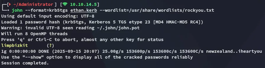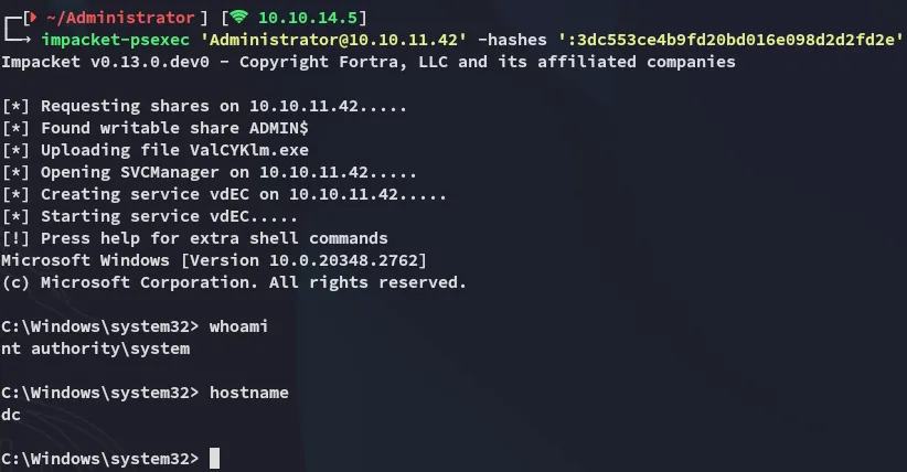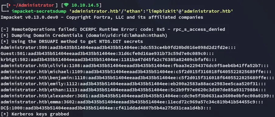 Now that I had Ethan’s creds I could easily abuse the DCSync privileges in combination with impacket-secretsdump: