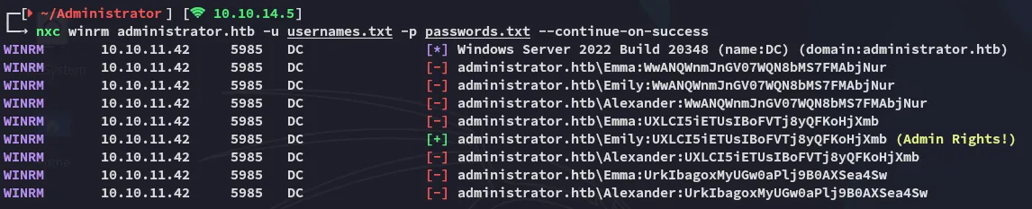 alexanderUrkIbagoxMyUGw0aPlj9B0AXSea4SwemilyUXLCI5iETUsIBoFVTj8yQFKoHjXmbemmaWwANQWnmJnGV07WQN8bMS7FMAbjNurI then went ahead and password sprayed these creds to see which one would stick: