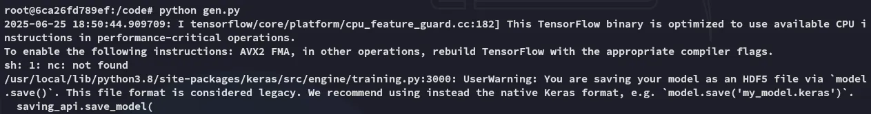 model = tf.keras.Sequential()model.add(tf.keras.layers.Input(shape=(64,)))model.add(tf.keras.layers.Lambda(exploit))model.compile()model.save("exploit.h5")Inside the docker container we will then craft it: