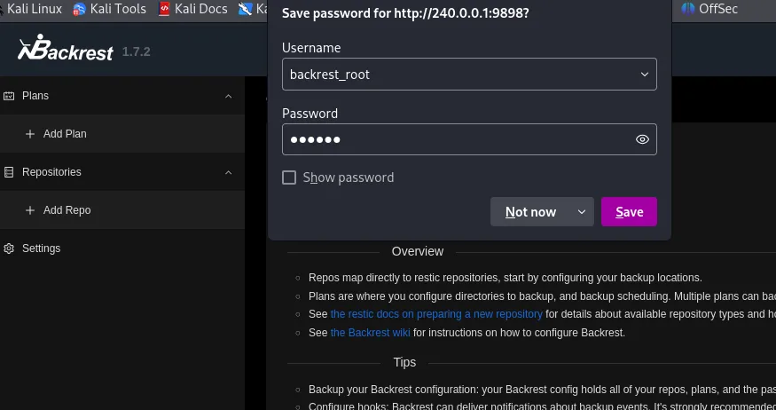 I then realized that I needed the password elsewhere, I’m supposed to port forward the local 9898 port for the backrest api so I can reach it from Kali.