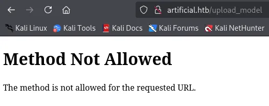 PORT STATE SERVICE REASON VERSION22/tcp open ssh syn-ack OpenSSH 8.2p1 Ubuntu 4ubuntu0.13 (Ubuntu Linux; protocol 2.0)80/tcp open http syn-ack nginx 1.18.0 (Ubuntu)| http-methods:|_ Supported Methods: GET HEAD POST OPTIONS|_http-server-header: nginx/1.18.0 (Ubuntu)|_http-title: Did not follow redirect to http://artificial.htb/Service Info: OS: Linux; CPE: cpe:/o:linux:linux_kernel80/TCP - HTTP
