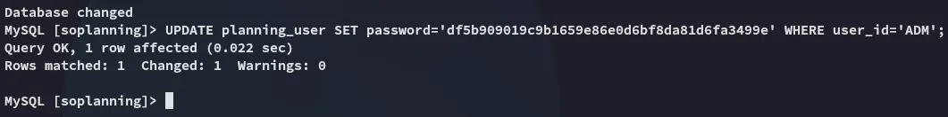 UPDATE planning_user SET password='df5b909019c9b1659e86e0d6bf8da81d6fa3499e' WHERE user_id='ADM';