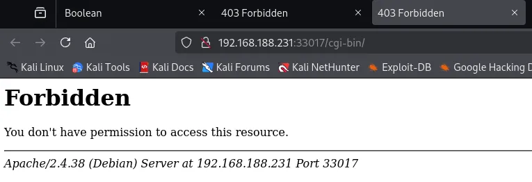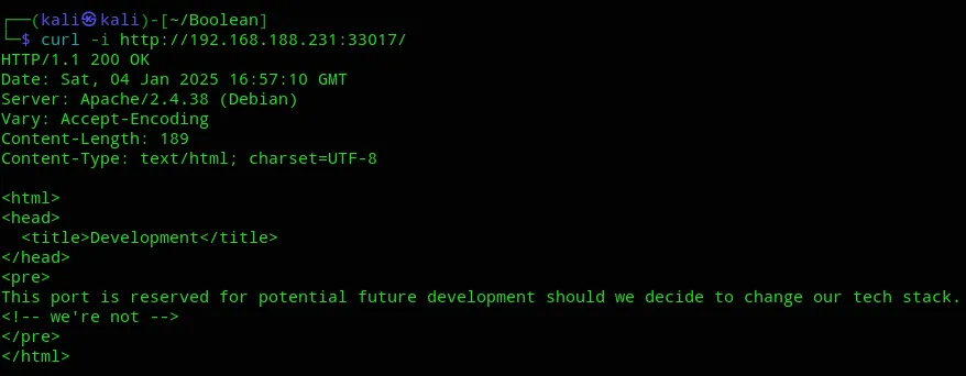PORT STATE SERVICE REASON VERSION22/tcp open ssh syn-ack OpenSSH 7.9p1 Debian 10+deb10u2 (protocol 2.0)80/tcp open http syn-ack|_http-title: Site doesn't have a title (text/html; charset=UTF-8).| fingerprint-strings:| DNSStatusRequestTCP, DNSVersionBindReqTCP, GenericLines, Help, JavaRMI, Kerberos, LANDesk-RC, LDAPBindReq, LDAPSearchReq, LPDString, NCP, NotesRPC, RPCCheck, RTSPRequest, SIPOptions, SMBProgNeg, SSLSessionReq, TLSSessionReq, TerminalServer, TerminalServerCookie, WMSRequest, X11Probe, afp, giop, ms-sql-s, oracle-tns:| HTTP/1.1 400 Bad Request| FourOhFourRequest, GetRequest, HTTPOptions:| HTTP/1.0 403 Forbidden| Content-Type: text/html; charset=UTF-8|_ Content-Length: 03000/tcp closed ppp conn-refused33017/tcp open http syn-ack Apache httpd 2.4.38 ((Debian))| http-methods:|_ Supported Methods: GET HEAD POST OPTIONS|_http-title: Development|_http-server-header: Apache/2.4.38 (Debian)That’s weird, we get 3 ports of which 3000 seems to be closed but still shown, and 80 is open but has a 403 code. I decided to check it using curl: