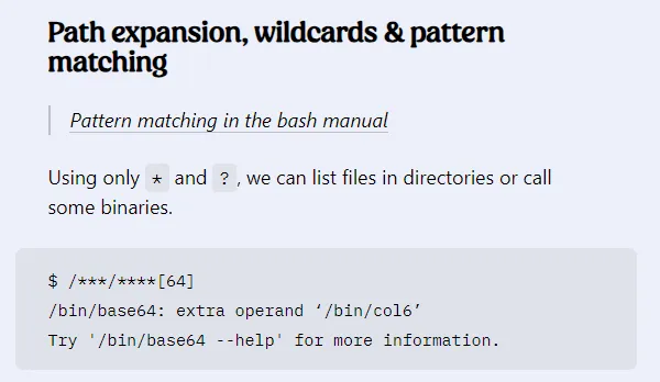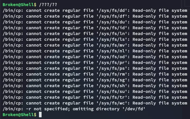 If we try to execute the above command, the shell expands it to every matching file (like /bin/cp, /bin/ls, /bin/rm) and tries to run the first one with the others as arguments. After some testing I found that the /bin/ls binary was in 7th which meant I could use the following command to execute it: