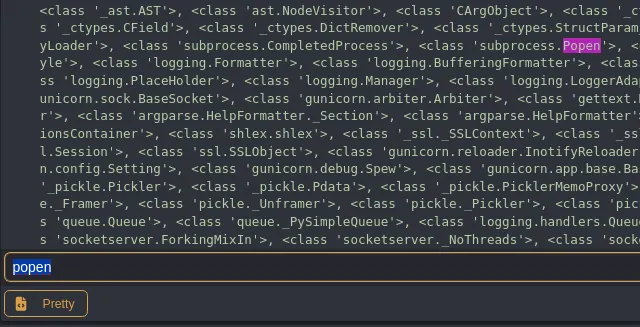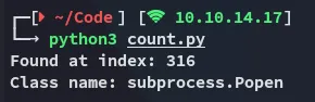 for idx, name in enumerate(class_entries): if 'popen' in name.lower(): print(f'Found at index: {idx}') print(f'Class name: {name}') breakelse: print('popen not found.')This gave me the following output: