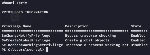 There are no hotfixes or installed patches, meaning it’s a clean install. Let’s look for priv esc options.