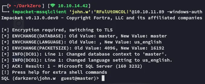 What we need is a TGT ticket from the users over on DC01. I’ll use the following command from a new mssqlclient instance to get this:
