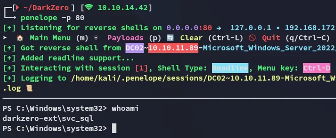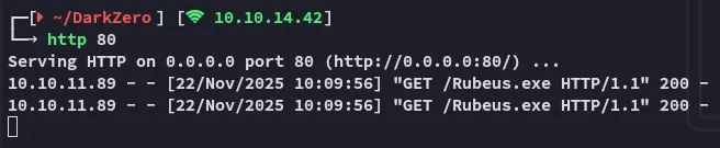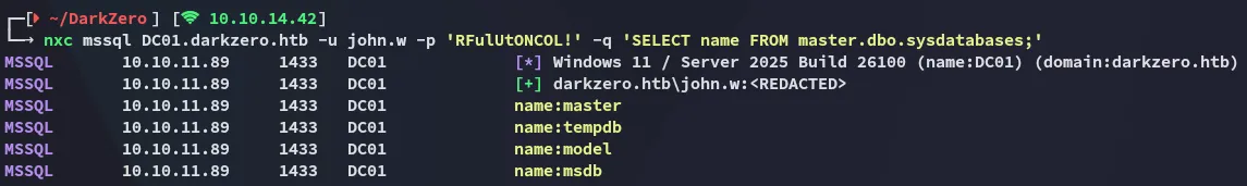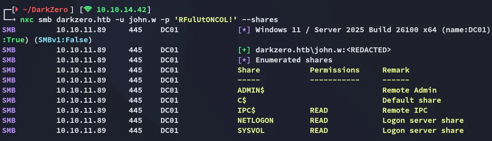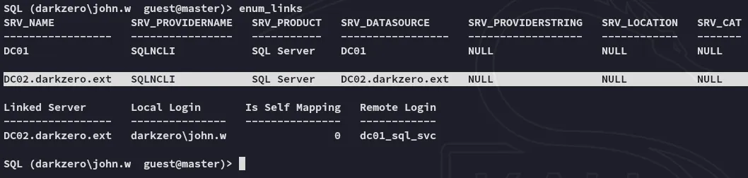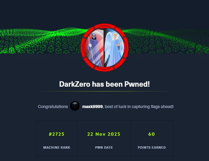 sudo nmap -sC -sV -sT -p- -vvvv -T5 --min-rate=5000 -Pn darkzero.htbPORT STATE SERVICE REASON VERSION53/tcp open domain syn-ack Simple DNS Plus88/tcp open kerberos-sec syn-ack Microsoft Windows Kerberos (server time: 2025-11-14 18:27:45Z)135/tcp open msrpc syn-ack Microsoft Windows RPC139/tcp open netbios-ssn syn-ack Microsoft Windows netbios-ssn389/tcp open ldap syn-ack Microsoft Windows Active Directory LDAP (Domain: darkzero.htb0., Site: Default-First-Site-Name)445/tcp open microsoft-ds? syn-ack464/tcp open kpasswd5? syn-ack593/tcp open ncacn_http syn-ack Microsoft Windows RPC over HTTP 1.0636/tcp open ssl/ldap syn-ack Microsoft Windows Active Directory LDAP (Domain: darkzero.htb0., Site: Default-First-Site-Name)1433/tcp open ms-sql-s syn-ack Microsoft SQL Server 2022 16.00.1000.00; RTM| ms-sql-ntlm-info:| 10.10.11.89:1433:| Target_Name: darkzero| NetBIOS_Domain_Name: darkzero| NetBIOS_Computer_Name: DC01| DNS_Domain_Name: darkzero.htb| DNS_Computer_Name: DC01.darkzero.htb| DNS_Tree_Name: darkzero.htb|_ Product_Version: 10.0.26100|_ssl-date: 2025-11-14T18:29:23+00:00; +2h10m01s from scanner time.| ms-sql-info:| 10.10.11.89:1433:| Version:| name: Microsoft SQL Server 2022 RTM| number: 16.00.1000.00| Product: Microsoft SQL Server 2022| Service pack level: RTM| Post-SP patches applied: false|_ TCP port: 14332179/tcp open vmrdp? syn-ack3268/tcp open ldap syn-ack Microsoft Windows Active Directory LDAP (Domain: darkzero.htb0., Site: Default-First-Site-Name)3269/tcp open ssl/ldap syn-ack Microsoft Windows Active Directory LDAP (Domain: darkzero.htb0., Site: Default-First-Site-Name)5985/tcp open http syn-ack Microsoft HTTPAPI httpd 2.0 (SSDP/UPnP)|_http-title: Not Found|_http-server-header: Microsoft-HTTPAPI/2.09389/tcp open mc-nmf syn-ack .NET Message Framing49664/tcp open msrpc syn-ack Microsoft Windows RPC49666/tcp open msrpc syn-ack Microsoft Windows RPC49690/tcp open msrpc syn-ack Microsoft Windows RPC49692/tcp open ncacn_http syn-ack Microsoft Windows RPC over HTTP 1.049911/tcp open msrpc syn-ack Microsoft Windows RPC49940/tcp open msrpc syn-ack Microsoft Windows RPC49986/tcp open msrpc syn-ack Microsoft Windows RPC49998/tcp open msrpc syn-ack Microsoft Windows RPCService Info: Host: DC01; OS: Windows; CPE: cpe:/o:microsoft:windows