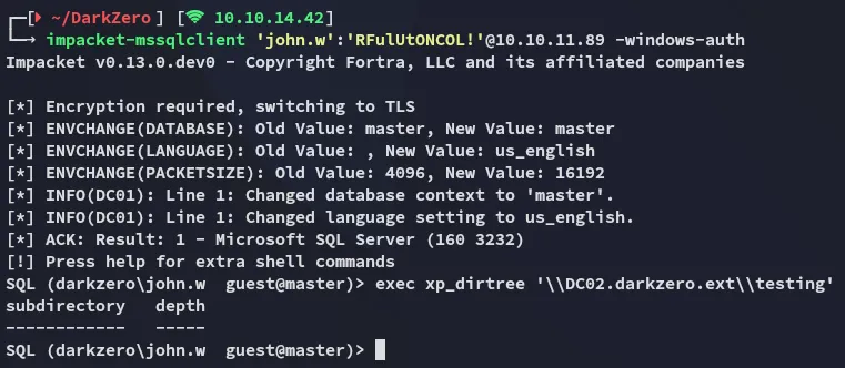exec xp_dirtree '\\DC02.darkzero.ext\\testing'