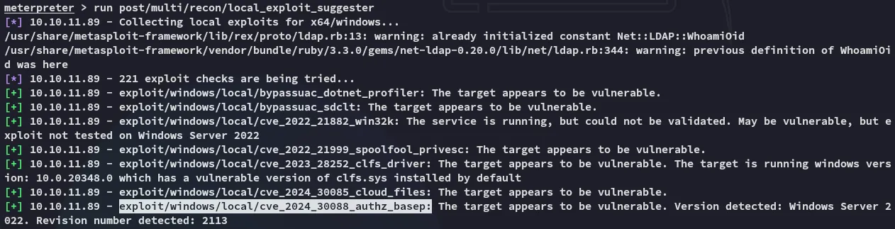 By running the exploit suggester I find that the target is indeed vulnerable to the previous found CVE: