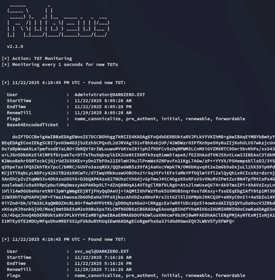 Rubeus.exe monitor /interval:1 /nowrapRight away we notice some output, however this is from the same system: