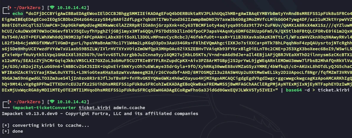 echo "doIFjDCCBYig.....xEQVJLWkVSTy5IVEI=" | base64 -d > ticket.kirbiimpacket-ticketConverter ticket.kirbi admin.ccache