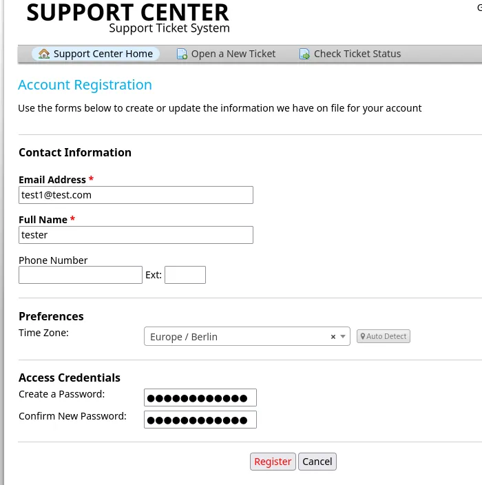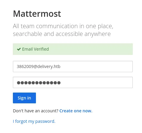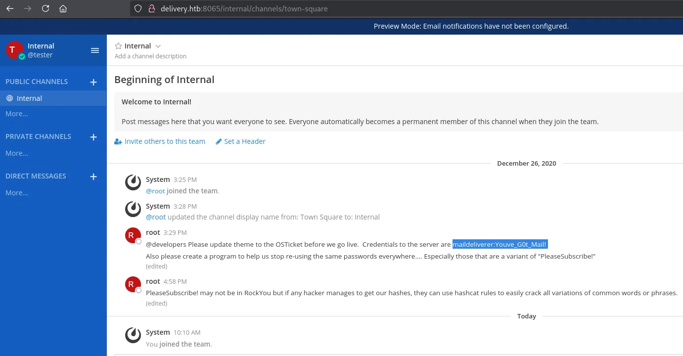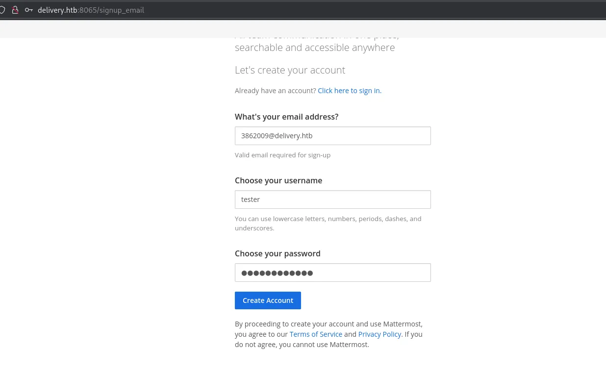 I then went on over to the Mattermost instance on port 8065 where I could register using the provided email address when I created the ticket: