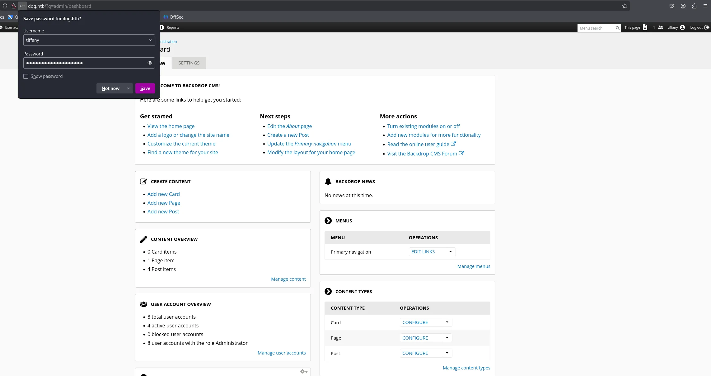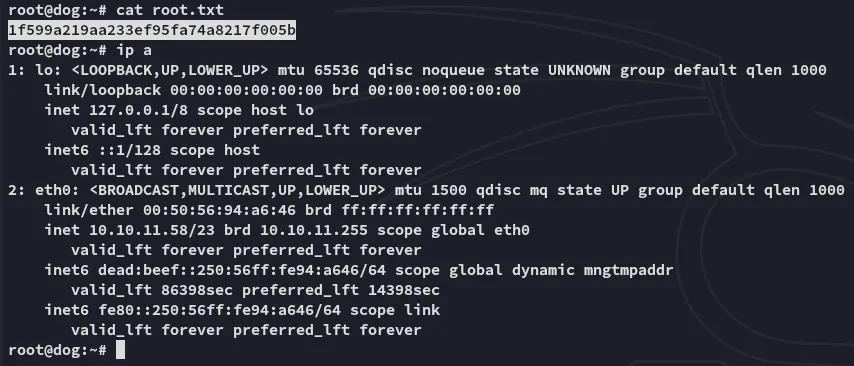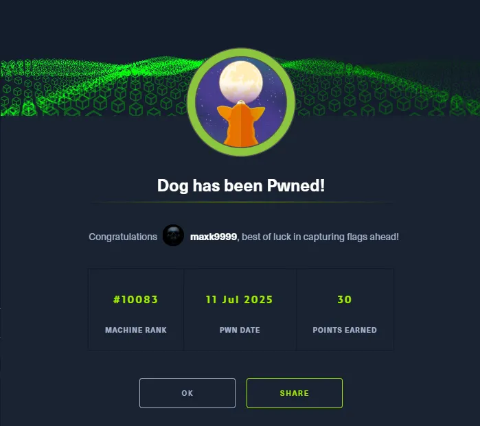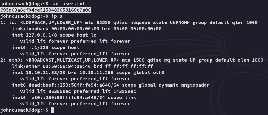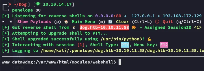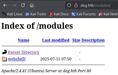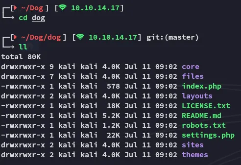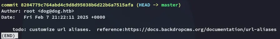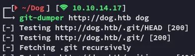 PORT STATE SERVICE REASON VERSION22/tcp open ssh syn-ack OpenSSH 8.2p1 Ubuntu 4ubuntu0.12 (Ubuntu Linux; protocol 2.0)80/tcp open http syn-ack Apache httpd 2.4.41 ((Ubuntu))| http-methods:|_ Supported Methods: GET HEAD POST OPTIONS|_http-generator: Backdrop CMS 1 (https://backdropcms.org)| http-robots.txt: 22 disallowed entries| /core/ /profiles/ /README.md /web.config /admin| /comment/reply /filter/tips /node/add /search /user/register| /user/password /user/login /user/logout /?q=admin /?q=comment/reply| /?q=filter/tips /?q=node/add /?q=search /?q=user/password|_/?q=user/register /?q=user/login /?q=user/logout|_http-server-header: Apache/2.4.41 (Ubuntu)|_http-favicon: Unknown favicon MD5: 3836E83A3E835A26D789DDA9E78C5510| http-git:| 10.10.11.58:80/.git/| Git repository found!| Repository description: Unnamed repository; edit this file 'description' to name the...|_ Last commit message: todo: customize url aliases. reference:https://docs.backdro...|_http-title: Home | DogService Info: OS: Linux; CPE: cpe:/o:linux:linux_kernelI notice there’s a .git repo found, let’s check it out.