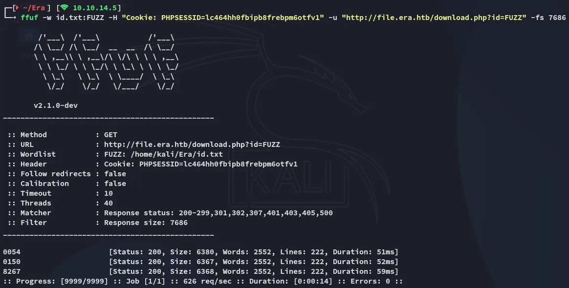 ffuf -w id.txt:FUZZ -H "Cookie: PHPSESSID=lc464hh0fbipb8frebpm6otfv1" -u "http://file.era.htb/download.php?id=FUZZ" -fs 7686