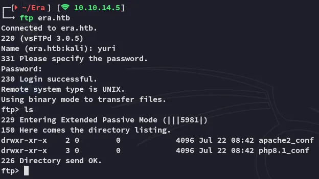 PORT STATE SERVICE REASON VERSION21/tcp open ftp syn-ack vsftpd 3.0.580/tcp open http syn-ack nginx 1.18.0 (Ubuntu)|_http-favicon: Unknown favicon MD5: 0309B7B14DF62A797B431119ADB37B14|_http-title: Era Designs| http-methods:|_ Supported Methods: GET HEAD|_http-server-header: nginx/1.18.0 (Ubuntu)Service Info: OSs: Unix, Linux; CPE: cpe:/o:linux:linux_kernel80/TCP - HTTP