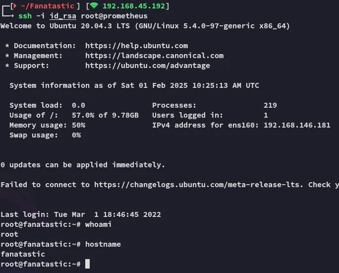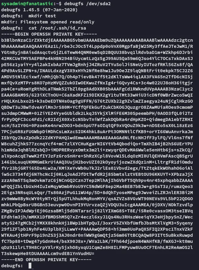 Then using debugfs /dev/sda2 we go ahead and read the contents of root’s /.ssh/id_rsa file.