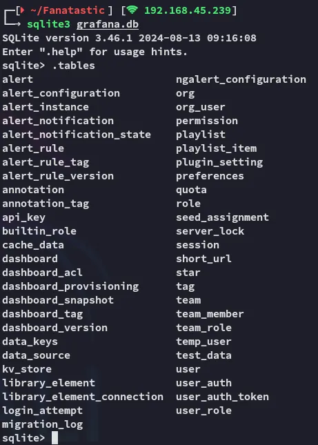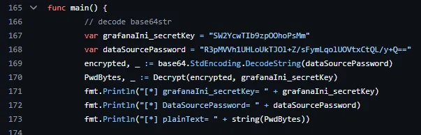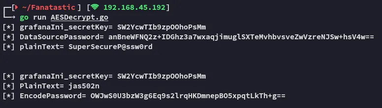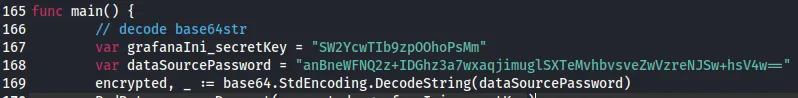 SELECT * FROM data_source;[{"id":1,"org_id":1,"version":1,"type":"prometheus","name":"Prometheus","access":"server","url":"http://localhost:9090","password":"","user":"","database":"","basic_auth":0,"basic_auth_user":"sysadmin","basic_auth_password":"","is_default":0,"json_data":"{}","created":"2022-02-04 09:19:59","updated":"2022-02-04 09:19:59","with_credentials":0,"secure_json_data":"{\"basicAuthPassword\":\"anBneWFNQ2z+IDGhz3a7wxaqjimuglSXTeMvhbvsveZwVzreNJSw+hsV4w==\"}","read_only":0,"uid":"HkdQ8Ganz"}]Note the basicAuthPassword here, let’s write it down.