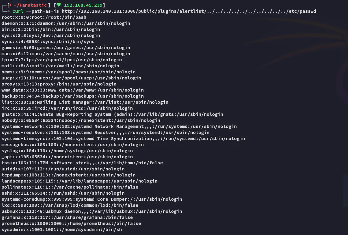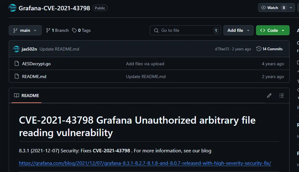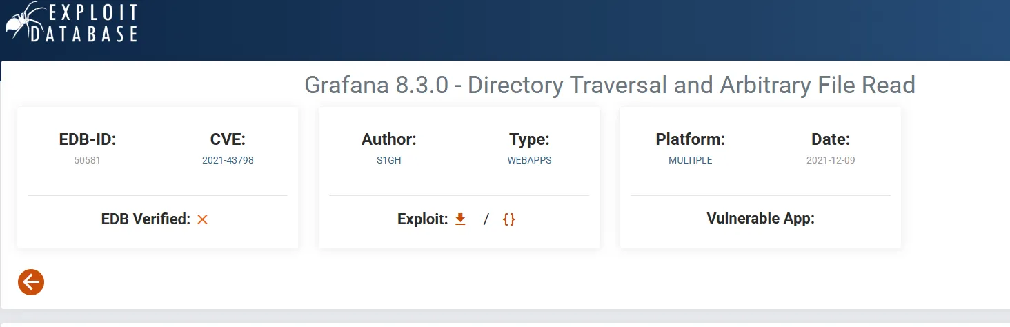 PORT STATE SERVICE REASON VERSION22/tcp open ssh syn-ack OpenSSH 8.2p1 Ubuntu 4ubuntu0.4 (Ubuntu Linux; protocol 2.0)3000/tcp open http syn-ack Grafana http| http-robots.txt: 1 disallowed entry|_/| http-methods:|_ Supported Methods: GET HEAD POST OPTIONS|_http-favicon: Unknown favicon MD5: F69DADBD5936359AF76AAB84559E849F| http-title: Grafana|_Requested resource was /login|_http-trane-info: Problem with XML parsing of /evox/about9090/tcp open http syn-ack Golang net/http server (Go-IPFS json-rpc or InfluxDB API)| http-title: Prometheus Time Series Collection and Processing Server|_Requested resource was /graph| http-methods:|_ Supported Methods: GET OPTIONS|_http-favicon: Unknown favicon MD5: 5EE43B38986A144D6B5022EA8C8F748FService Info: OS: Linux; CPE: cpe:/o:linux:linux_kernelI noticed the Grafana service running on port 3000 so looked up available PoC’s for it: