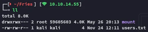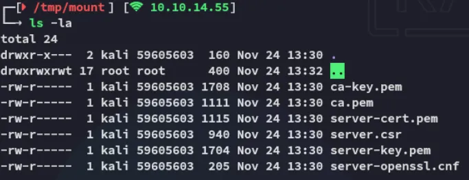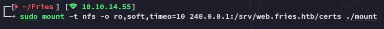 sudo mkdir ./mountsudo mount -t nfs -o ro,soft,timeo=10 240.0.0.1:/srv/web.fries.htb/certs ./mount