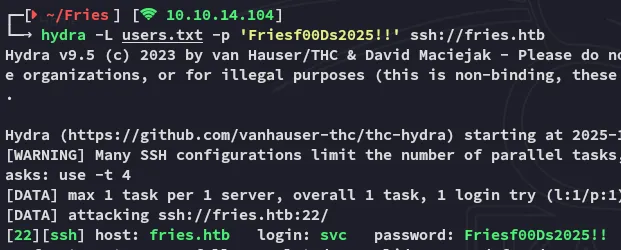 Friesf00Ds2025!!Next up I tried spraying this password against found users until I found one that matched: