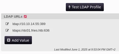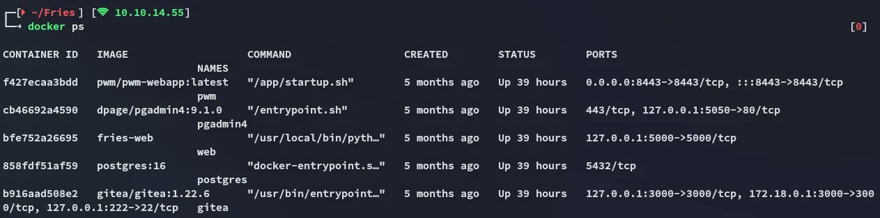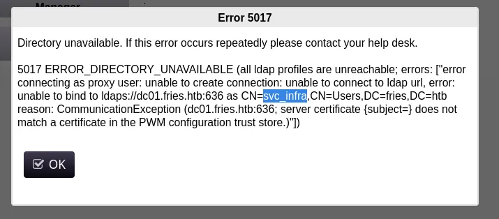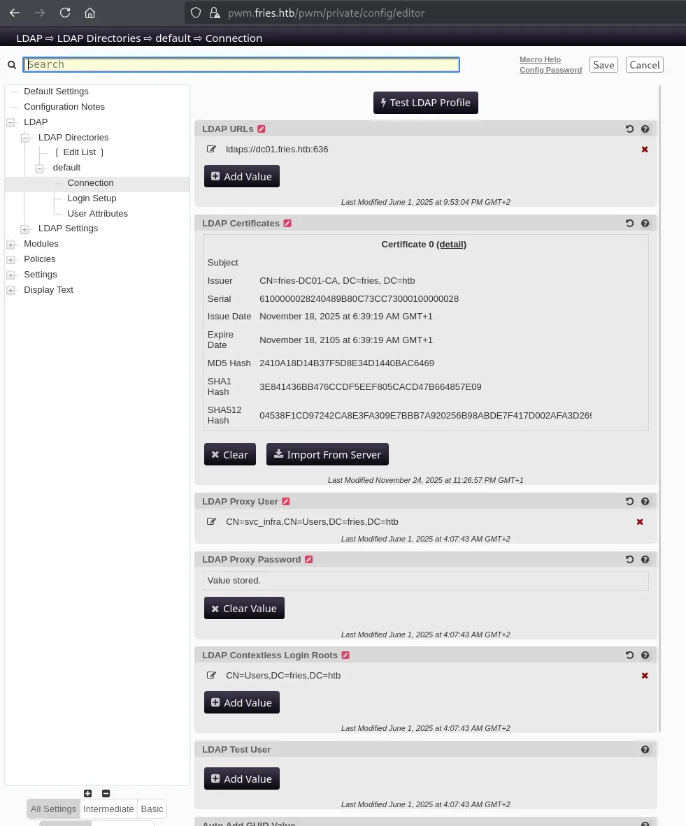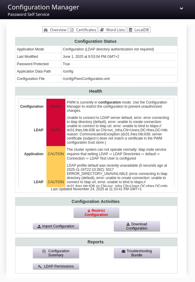 PORT STATE SERVICE REASON VERSION22/tcp open ssh syn-ack OpenSSH 8.9p1 Ubuntu 3ubuntu0.13 (Ubuntu Linux; protocol 2.0)53/tcp open domain syn-ack Simple DNS Plus80/tcp open http syn-ack nginx 1.18.0 (Ubuntu)| http-methods:|_ Supported Methods: OPTIONS GET HEAD|_http-title: Welcome to Fries - Fries Restaurant|_http-server-header: nginx/1.18.0 (Ubuntu)88/tcp open kerberos-sec syn-ack Microsoft Windows Kerberos (server time: 2025-11-23 02:02:57Z)135/tcp open msrpc syn-ack Microsoft Windows RPC139/tcp open netbios-ssn syn-ack Microsoft Windows netbios-ssn389/tcp open ldap syn-ack Microsoft Windows Active Directory LDAP (Domain: fries.htb0., Site: Default-First-Site-Name)|_ssl-date: 2025-11-23T02:04:36+00:00; +1h59m20s from scanner time.| ssl-cert: Subject:| Subject Alternative Name: DNS:DC01.fries.htb, DNS:fries.htb, DNS:FRIES| Issuer: commonName=fries-DC01-CA/domainComponent=fries443/tcp open ssl/http syn-ack nginx 1.18.0 (Ubuntu)| http-methods:|_ Supported Methods: GET HEAD POST OPTIONS| tls-alpn:|_ http/1.1|_http-server-header: nginx/1.18.0 (Ubuntu)|_ssl-date: TLS randomness does not represent time|_http-favicon: Unknown favicon MD5: F588322AAF157D82BB030AF1EFFD8CF9|_http-title: Site doesnt have a title (text/html;charset=ISO-8859-1).| ssl-cert: Subject: commonName=pwm.fries.htb/organizationName=Fries Foods LTD/stateOrProvinceName=Madrid/countryName=SP/organizationalUnitName=PWM Configuration/emailAddress=web@fries.htb/localityName=Madrid| Issuer: commonName=pwm.fries.htb/organizationName=Fries Foods LTD/stateOrProvinceName=Madrid/countryName=SP/organizationalUnitName=PWM Configuration/emailAddress=web@fries.htb/localityName=Madrid445/tcp open microsoft-ds? syn-ack464/tcp open kpasswd5? syn-ack593/tcp open ncacn_http syn-ack Microsoft Windows RPC over HTTP 1.0636/tcp open ssl/ldap syn-ack Microsoft Windows Active Directory LDAP (Domain: fries.htb0., Site: Default-First-Site-Name)2179/tcp open vmrdp? syn-ack3268/tcp open ldap syn-ack Microsoft Windows Active Directory LDAP (Domain: fries.htb0., Site: Default-First-Site-Name)3269/tcp open ssl/ldap syn-ack Microsoft Windows Active Directory LDAP (Domain: fries.htb0., Site: Default-First-Site-Name)5985/tcp open http syn-ack Microsoft HTTPAPI httpd 2.0 (SSDP/UPnP)|_http-server-header: Microsoft-HTTPAPI/2.0|_http-title: Not Found9389/tcp open mc-nmf syn-ack .NET Message Framing49666/tcp open msrpc syn-ack Microsoft Windows RPC49685/tcp open ncacn_http syn-ack Microsoft Windows RPC over HTTP 1.049686/tcp open msrpc syn-ack Microsoft Windows RPC49688/tcp open msrpc syn-ack Microsoft Windows RPC49689/tcp open msrpc syn-ack Microsoft Windows RPC49913/tcp open msrpc syn-ack Microsoft Windows RPC49946/tcp open msrpc syn-ack Microsoft Windows RPCService Info: Host: DC01; OSs: Linux, Windows; CPE: cpe:/o:linux:linux_kernel, cpe:/o:microsoft:windows