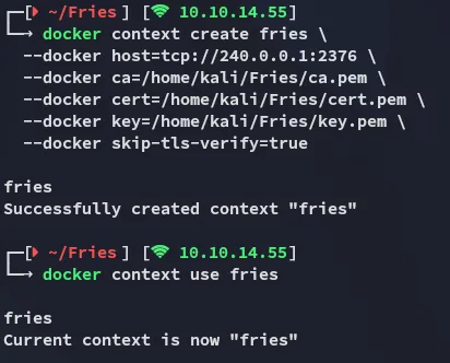docker context create fries \ --docker host=tcp://240.0.0.1:2376 \ --docker ca=/home/kali/Fries/ca.pem \ --docker cert=/home/kali/Fries/cert.pem \ --docker key=/home/kali/Fries/key.pem \ --docker skip-tls-verify=true