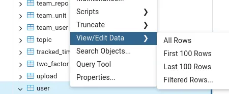 Here I right clicked on the user table to view all the rows: